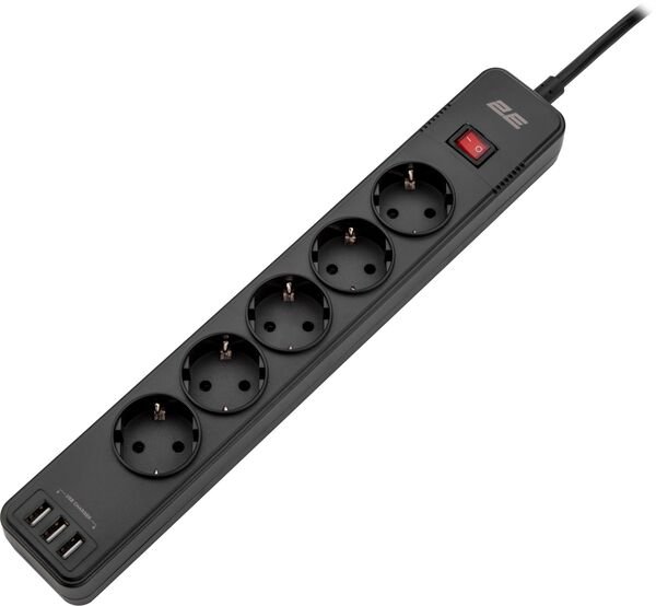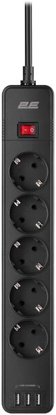 - Мережевий фільтр 2E 5XSchuko 3G*1.5мм, 3*USB-A, 2м, Black (2E-SP515M2USBBK)