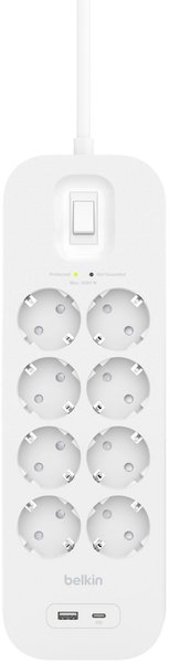 - Мережевий фільтр Belkin 8хSchuko, USB-A/USB-C 18Вт, 16А c защитой от перенапряжения, 2м (SRB003VF2M)
