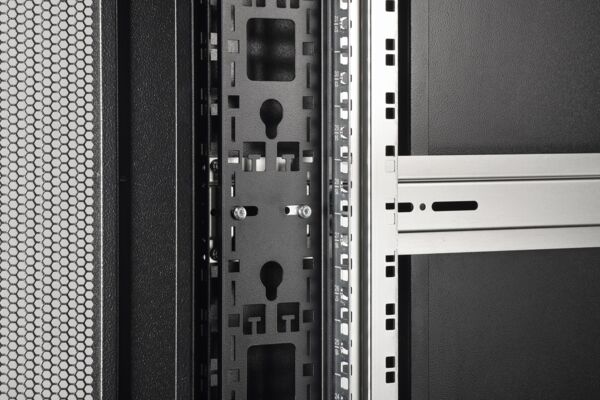 Серверні шафи серії Unique Server-N розроблені та виготовлені для зручного та гнучкого прокладання мережевих кабелів. Продумані вдосконалення забезпечують необхідну надійність та максимальну гнучкість. Модульна база забезпечує достатньо місця для кабелів будь-якого типу. Крім того, у задній частині бази передбачені кабельні вводи з щітками. Вбудовані кріплення для розеткових блоків у задній частині шафи ідеально доповнюють універсальні можливості. Перфоровані сталеві дверцята, як спереду, так і ззаду, забезпечують покращену циркуляцію повітря і, отже, оптимальне пасивне охолодження. Всередині встановлено дві пари оцинкованих 483-міліметрових (19") профільних рейок, маркованих позначками висоти, які можна читати в обох напрямках. Вони плавно регулюються та з'єднані з додатковими опорами глибини в шафі. Кожна шафа - це міцна сталева конструкція, виготовлена з листової сталі товщиною до 1,5 мм. Фарбування виконується за допомогою електростатичного порошкового покриття у стандартних кольорах: сірий (RAL 7035) та чорний (RAL 9005). Модульні бокові панелі та двері, що закриваються на замок і знімаються, покращують доступність. Петлі дверей можна замінити. Крім того, у разі потреби шафи можна повністю розібрати.