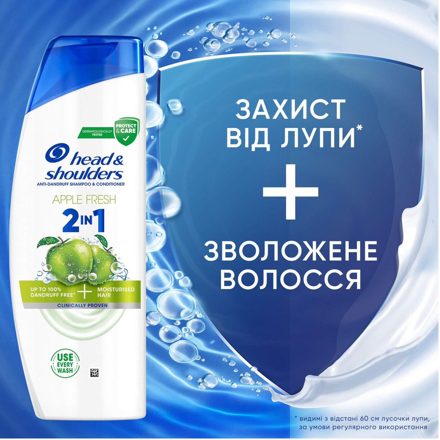 Шампунь-кондиціонер Head & Shoulders «Яблучна свіжість» 2 в 1 для всіх типів волосся і шкіри голови ефективно бореться навіть із затятою лупою. Він ідеально підходить для щоденного використання як для чоловіків, так і для жінок, завдяки формулі, що підтримує баланс мікробіома шкіри голови та усуває першопричину лупи. Він впливає на як видиму, так і невидиму лупу, вивільняючи вдвічі більше захисних компонентів, які проникають у пори і запобігають поверненню стійкої лупи. Формула 2 в 1 містить на 25% більше кондиціонуючих речовин порівняно зі звичайним шампунем Head & Shoulders. Цей засіб клінічно доведено, дерматологічно протестовано і має збалансований рівень рН.