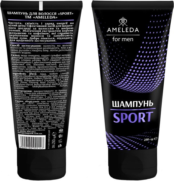 У сучасних чоловіків завжди занадто багато справ, щоб дозволити собі зайву хвилинку на догляд або турботу про себе. Проте, кожен представник сильної половини людства хоче мати красивий і привабливий вигляд. Саме тому ми створили шампунь ameleda for men sport, який ефективно видаляє забруднення, дбає про шкіру голови та дарує відчуття свіжості і чистоти на цілий день! До складу засобу входить екстракт кореня женьшеню та кофеїн, які сприяють укріпленню волосся та запобігають появі лупи.