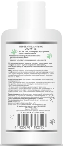 Шампунь Doctor Vet - це спеціалізований засіб для догляду за шерстю і шкірою собак, призначений для регулярного миття і підтримки чистоти вашого домашнього улюбленця. Містить м'який мийний комплекс, витяжки рослин, в тому числі витяжку жасмину. Здатний зміцнювати, зволожувати, пом'якшувати шерсть і відновлювати її природний блиск по всій довжині. Це важливий засіб для підтримки гігієни, здоров'я і приємного вигляду вашого домашнього улюбленця. Вибір відповідного шампуню і регулярний догляд допоможуть вашій собаці відчувати себе комфортно і мати гарний вигляд шерсті.