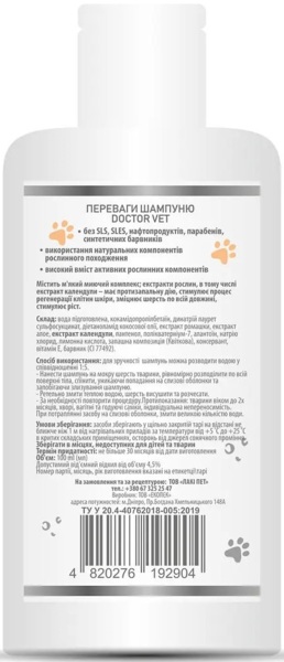 Шампунь Doctor Vet - це спеціалізований засіб для догляду за шерстю і шкірою собак, призначений для регулярного миття і підтримки чистоти вашого домашнього улюбленця. Містить м'який мийний комплекс, здатний відновлювати структуру шерсті, запобігає утворенню лупи і зменшує прояви грибкової інфекції шкіри. Містить м'який миючий комплекс, витяжки рослин, в тому числі витяжку календули. Має протизапальну дію, стимулює процес регенерації клітин шкіри, зміцнює шерсть по всій довжині, стимулює ріст. Це важливий засіб для підтримки гігієни, здоров'я і приємного вигляду вашого домашнього улюбленця. Вибір відповідного шампуню і регулярний догляд допоможуть вашій собаці відчувати себе комфортно і мати гарний вигляд шерсті.