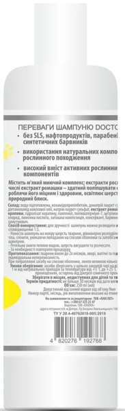 | Склад | Вода підготовлена, кокамідопропілбетаїн, динарій лаурет сульфосукцинат, діетаноламід кокосової олії, натрію лаурет сульфат, екстракт ромашки, екстракт кропиви, гідролізат кератину, пантенол, (полікватерніум-7), цетримоніум хлорид, натрію хлорид, лимонна кислота, запашна композиція, консервант, барвники (Е151, CI 77891), мутник |