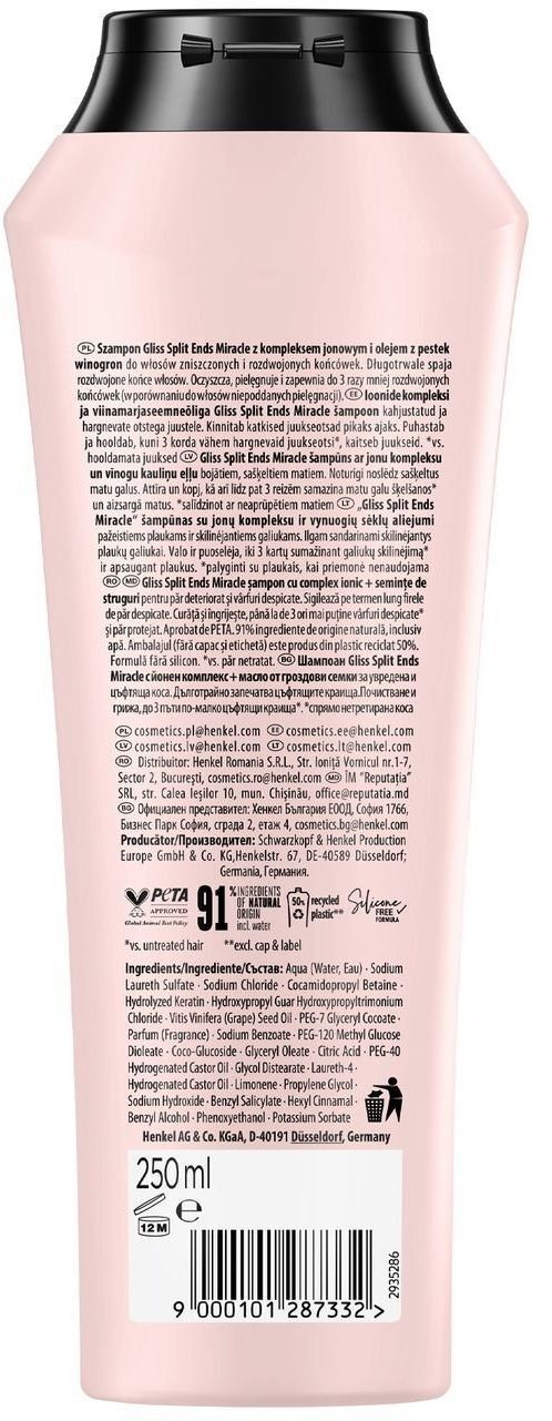 | Склад | Aqua (Water, Eau); Sodium Laureth Sulfate; Sodium Chloride; Cocamidopropyl Betaine; Hydrolyzed Keratin; Hydroxypropyl Guar Hydroxypropyltrimonium Chloride; Vitis Vinifera (Grape) Seed Oil; PEG-7 Glyceryl Cocoate; Parfum (Fragrance); Sodium Benzoate; PEG-120 Methyl Glucose Dioleate; Coco-Glucoside; Glyceryl Oleate; Citric Acid; PEG-40 Hydrogenated Castor Oil; Glycol Distearate; Laureth-4, Hydrogenated Castor Oil; Limonene; Propylene Glycol; Sodium Hydroxide; Benzyl Salicylate; Hexyl Cinnamal; Benzyl Alcohol; Phenoxyethanol; Potassium Sorbate |