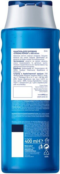 Шампунь Strong power для чоловіків - це засіб, який дасть змогу зберегти здоров'я і силу вашого волосся, навіть в умовах екстремального навантаження. Нова формула з морськими мінералами надає волоссю зміцнювального ефекту, працюючи дбайливо і не втручаючись у природний баланс шкіри голови. Після використання цього шампуню ваше волосся виглядатиме більш здоровим і сильним. Nivea завжди піклується про здоров'я вашого волосся і про безпеку довкілля. Новий продукт має 99% біорозкладну та веганську формулу, і, важливо зауважити, не містить частинок мікропластику.