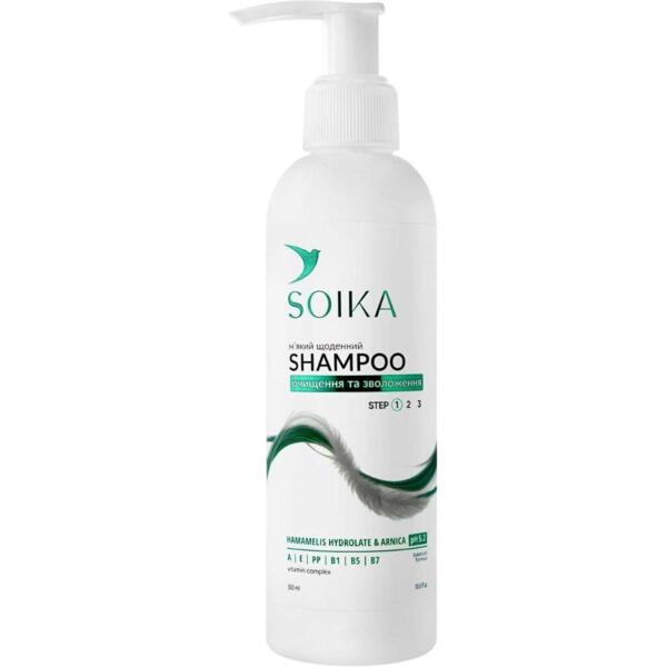 М'який щоденний шампунь SOIKA з гідролатами гамамелісу, арніки та вітамінами для всіх типів волосся. Завдяки нейтральному рівню pH 5,2 (pH шкіри людини 5,5) шампунь делікатно очищає шкіру голови та волосся, не пошкоджуючи захисний шар шкіри та не травмуючи волосся. Продукт зволожує, сприяє нормалізації pH, надає об'єм, захищає від сухості, ламкості, надмірного виділення ліпідів. Вітамінний комплекс A, E, B1, B5, B7, PP з гідролатами гамамелісу та арніки містить велику кількість важливих антиоксидантів. Волосся довше залишається чистим і красивим, стає міцнішим, блискучим, пишним і здоровим. Компоненти комплексу нормалізують стан шкіри, активують оновлення клітин і зміцнюють структуру волосся. Гідролати позбавляють від сухості, лупи, себорейних проявів на шкірі голови. Складники шампуню зміцнюють волосся, захищають його від випадіння і передчасного посивіння, підвищують опірність шкіри до несприятливих факторів.