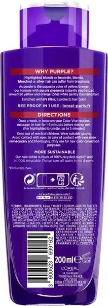 Ваша мрія здійснилася, ви стали щасливою власницею розкішного, білявого волосся, і тепер хочеться зберегти новий відтінок локонів якомога довше. Згодом на пасмах може проявлятися неприємний, жовтий відтінок, який може зіпсувати все враження. Тонуючий шампунь для світлого волосся від відомого французького бренду L'Oréal Paris швидко позбавить небажаного "теплого" відтінку ваші локони. Спеціальна формула шампуню з фіолетовими пігментами дбайливо очищає від забруднень, нейтралізує жовтизну та мідні відтінки, а також насичує поживними речовинами та зберігає елегантний, холодний тон блонду.