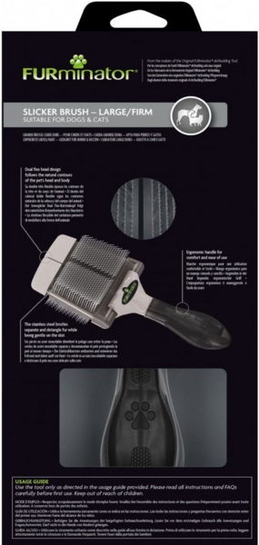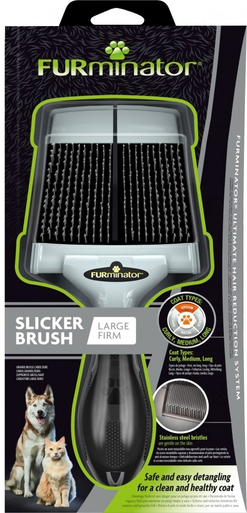 Жорстка щітка-пуходерка FURminator – це професійний інструмент для видалення ковтунів та розплутування шерсті вашого вихованця. Після її застосування шерсть стає гладкою і блискучою. Щітка розроблена спеціально для собак і котів з кучерявою, середньою та довгою шерстю. Двостороння щітка-пуходерка не травмує шкіру, попри те, що щетина двох видів зроблена з нержавіючої сталі: вигнуті щетинки допомагають видалити ковтуни та сплутану шерсть, не пошкоджуючи її, а прямі щетинки – зробити шерсть гладкою та блискучою. Двостороння конструкція з гнучкою насадкою повторює природні контури голови та тіла вихованця, що не тільки полегшує грумінг, але також приносить задоволення вашому улюбленцю. Ергономічна ручка гарантує зручне та безпечне використання.