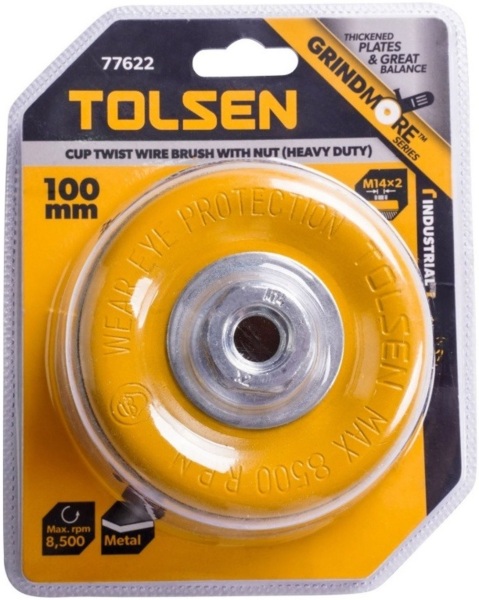 - Щітка чашкова Tolsen, торцева, переплетений дріт 0.5мм, 100мм, різьблення M14 (77622)