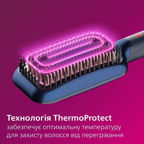 - Усього за 5 хвилин втілите мрію про природне пряме, красиве та блискуче волосся. Наша технологія ThermoProtect із системою іонного догляду в поєднанні зі щетинками особливої конструкції надає волоссю здорового та слухняного вигляду.