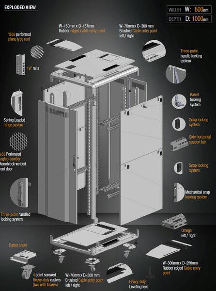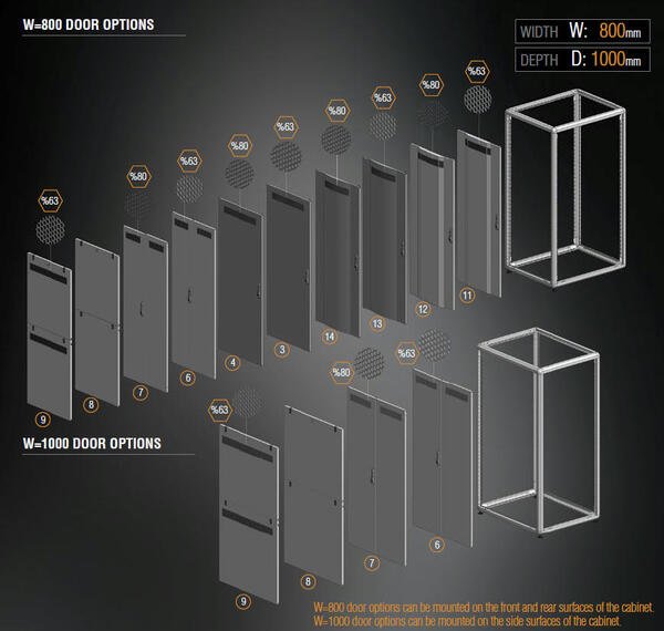 Стандартна модель передніх дверей для серверних шаф має 63% перфорацію опуклого типу. У той час як 63% перфорована структура забезпечує максимальну пасивну вентиляцію, двостороння зварна конструкція по всій довжині забезпечує додаткову стійкість. Опукла кутова конструкція, нахилена вперед, забезпечує стійкість до перфорованої зони, а також естетичний вигляд. Це також найбільш бажана модель вхідних дверей завдяки додатковій відстані, передбаченій на передніх панелях у напрямку до фасаду. Передні двері з підпружиненою системою петель забезпечують простоту використання та монтажу, оскільки їх можна знімати та встановлювати за потреби без використання будь-яких інструментів.