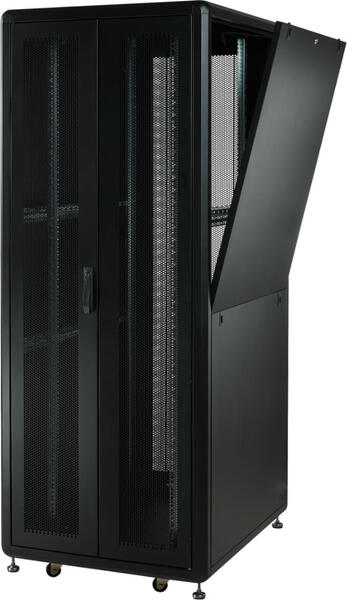 Стандартна модель бічних дверей для серверних шаф — це знімні, горизонтально розділені подвійні двері. Легко знімні бічні двері мають циліндричний запірний механізм замка. Завдяки спеціальній конструкції горизонтально роз'ємних подвійних дверей, нижні дверцята не можуть бути зняті, поки не будуть зняті верхні дверцята. Завдяки такій конструкції нижні дверцята також замикаються після того, як зачиняються верхні дверцята. Завдяки фіксаторам на бічних дверцятах ці дверцята можуть залишатися закритими на шафі, не обов'язково замикаючись на замок. У разі приєднання вентиляторних модулів з боків опціонально встановлюються горизонтально розсувні подвійні бічні двері з перфорацією 63%. Горизонтально прикріплені подвійні двері полегшують зняття і перенесення бічних дверей в процесі монтажу та обслуговування.