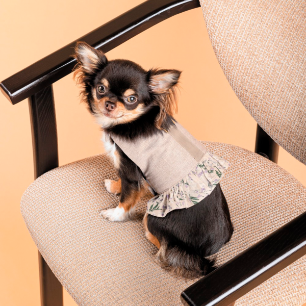 Льон і бавовна чудово доповнюють одне одного, а вишуканий дизайн перетворює сукню-шлейку на чарівне вбрання. Модель підкреслить чарівність вашої улюблениці! Це не просто гарненька сукня для хвостатої модниці. Це її комфорт під час прогулянки у спеку, бо натуральний льон і бавовна якнайкраще захищають від сонця, запобігають перегріванню. А ще ця сукня - зручна шлейка, яка на відміну від синтетичних моделей приємна до тіла, легка, виготовлена з дихаючих матеріалів. Тасьма з півкільцем на спинці дозволяють буквально одним рухом закріплювати повідець.