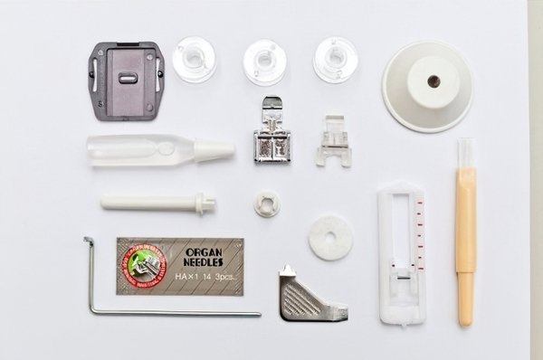 | Комплектація (можливі зміни в різних поставках) | Тримач для котушок (маленький), Документація, Додатковий тримач для котушок (великий), Голка – 3 шт., Пензлик-випарювач, Лапка для блискавки, Лапка для петлі, Лапка для пришивання гудзиків, Напрямний для країв вистібування, Викрутка, Пластинка для стрижня котушки, Універсальна лапка, Швейна машинка, Шпулька – 3 шт. |