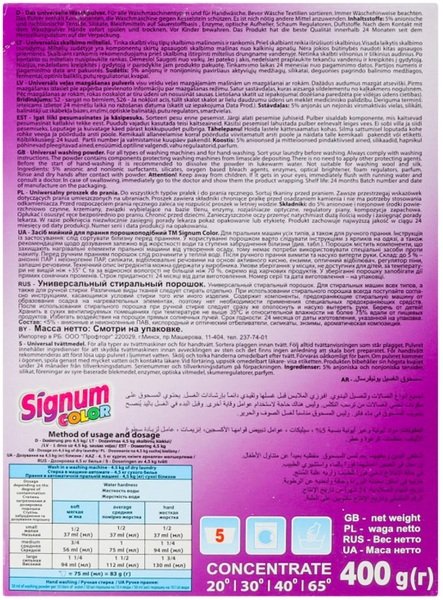 Універсальне бесфосфатное пральний засіб Signum Color є якісним і безпечним продуктом польської компанії Clovin. Пральний порошок Сигнум Колор ідеально підходить для прання білизни світлих і кольорових тканин. Не містить фосфатів і цеолітів. Добре відпирає свіжі забруднення різних типів і добре виполіскується. Ефективний навіть при 20 ºC, що дозволяє прати при коротких програмах прання. Завдяки цьому і входять до складу порошку силікатів перешкоджає утворенню накипу в пральній машині. В порошку міститься мінімальна кількість ПАР (максимум 5%), силікати, оптичні та кисневі відбілювачі, ензими, ароматичні добавки.