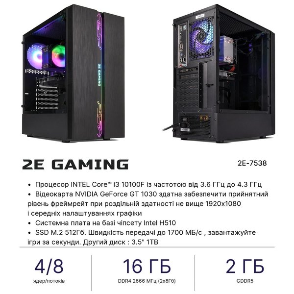 Технічне оснащення 2E Octal (2E-7538) передбачає процесор Intel Core i3-10100F 10-го покоління з високими обчислювальними можливостями, швидкодію системи забезпечить 16 ГБ ОЗП. У цій конфігурації виробник передбачив швидкісний SSD, який сприяє прискореному запуску програм, і місткий HDD для зберігання великих обсягів інформації.