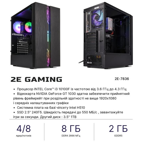 Технічне оснащення 2E Octal (2E-7836) передбачає процесор Intel Core i3-10100F 10-го покоління з високими обчислювальними можливостями, швидкодію системи забезпечить 8 ГБ ОЗП. У цій конфігурації виробник передбачив швидкісний SSD, який сприяє прискореному запуску програм, і місткий HDD для зберігання великих обсягів інформації.
