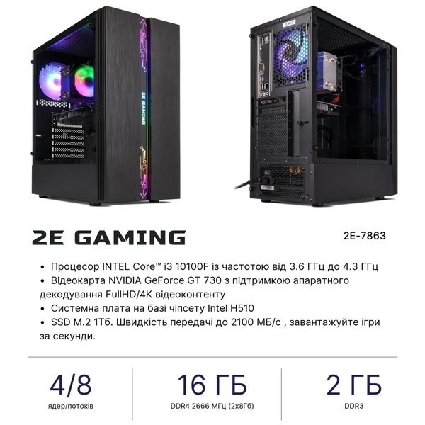Технічне оснащення 2E Octal (2E-7863) передбачає процесор Intel Core i3-10100F 10-го покоління з високими обчислювальними можливостями, швидкодію системи забезпечить 16 ГБ ОЗП. У цій конфігурації виробник передбачив швидкісний SSD, який сприяє прискореному запуску програм.