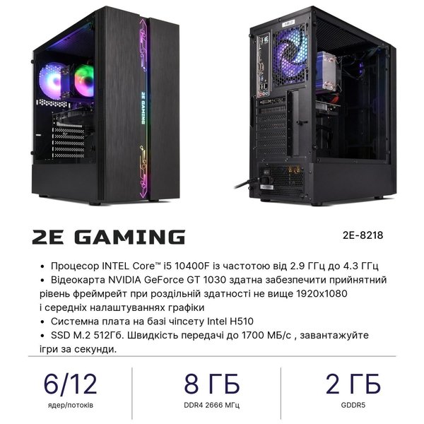 Технічне оснащення Octal 2E (2E-8218) включає процесор Intel Core i5-10400F 10-го покоління з високими обчислювальними можливостями, швидкодія системи забезпечить 8 ГБ ОЗУ. У цій конфігурації виробник передбачив швидкісний SSD.