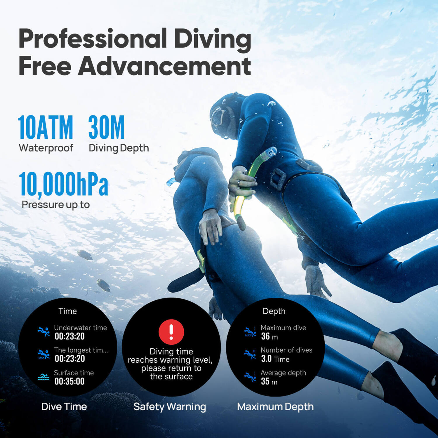 Відстежуйте своє занурення в режимі реального часу за такими ключовими показниками, як швидкість підйому та спуску, поточна глибина, максимальна глибина, час занурення, кількість занурень та інші професійні показники.