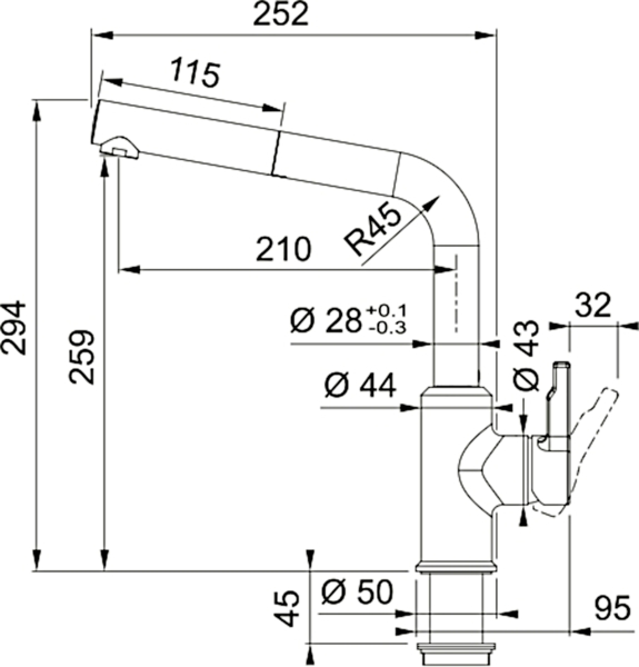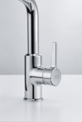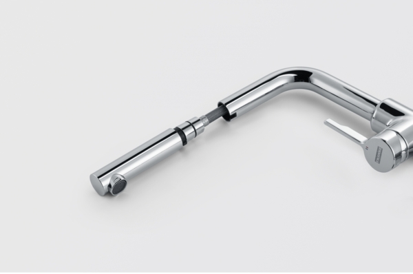 Витяжний вилив дозволяє зручно мити всю поверхню мийки та наповнювати посуд, який розміщений поза її межами. Завдяки ретельно продуманій конструкції змішувача, кількість місць, де потенційно може накопичуватись забруднення, зведена до мінімуму, тому доглядати за змішувачем дуже просто. Кут повороту виливу складає, 150° тому вилив може використовуватися для роботи на великій площі мийки.