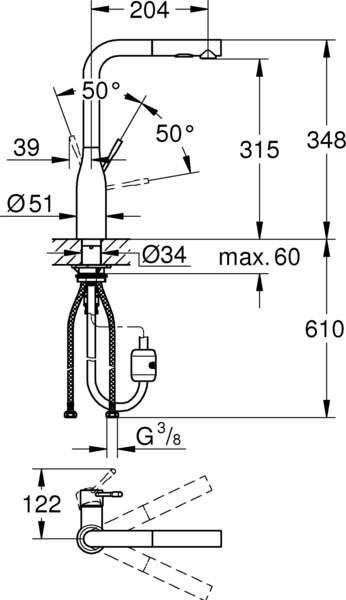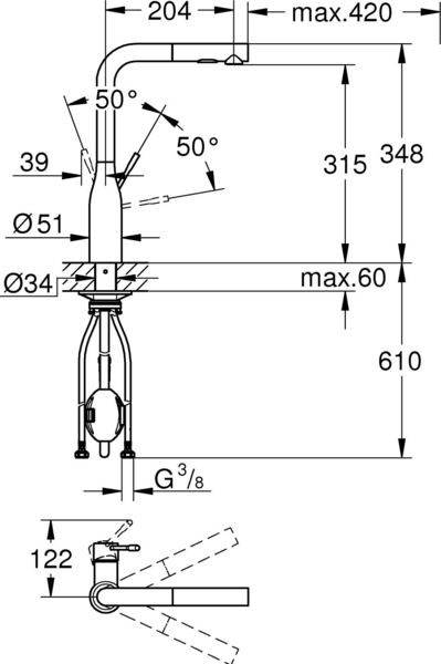 Вилив повертається на 360° для максимальної гнучкості, в той час, як зручна висувна лійка з цільного металу має два режими струменю - стандартний і потужний. Перемикатися між ними можна одним натисканням кнопки. Він ідеально підходить для виконання безлічі кухонних завдань, від наповнення каструль до миття овочів і подальшого прибирання - довжини шланга вистачає по ширині подвійної мийки. Система Grohe EasyDock також означає, що розпилювальна ручна лійка легко повертається на місце в корпус змішувача.