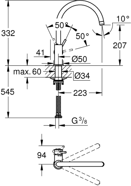 - Змішувач для кухні Grohe QuickFix Start Classic, довж.виливу - 223мм, поворотний, 1важіль, хром
