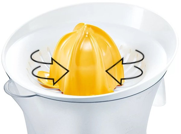 Універсальна конус преса спеціально розроблений як для маленьких, так і для великих цитрусових. Тепер Ви можете видавити останню краплю соку завдяки руху конуса в різні боки.