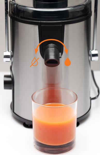 Спеціально розроблений носик для соку можна встановити у два положення. Коли носик перебуває у відкритому положенні, свіжий сік можна вільно виливати в контейнер (0,6 л), що входить до комплекту, або безпосередньо в склянку. Коли носик закрито, сік не буде крапати.