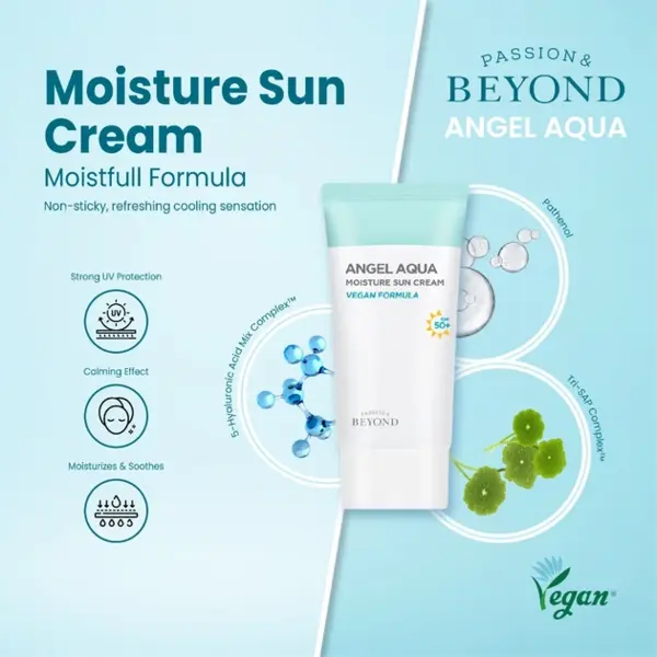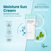 Beyond Angel Aqua Moisture Sun Cream SPF50+ PA+++ - це зволожувальний сонцезахисний крем із високим ступенем захисту, який ефективно захищає шкіру від ультрафіолетового випромінювання і запобігає її пошкодженню. Він зволожує, покращуючи текстуру і м'якість шкіри, водночас заспокоює і знижує запалення завдяки активним рослинним екстрактам. Крем сприяє відновленню клітин, підтримуючи здоров'я і сяйво шкіри, а його легка текстура швидко поглинається, не залишаючи жирності, створюючи невидимий бар'єр від забруднень і зовнішніх чинників.