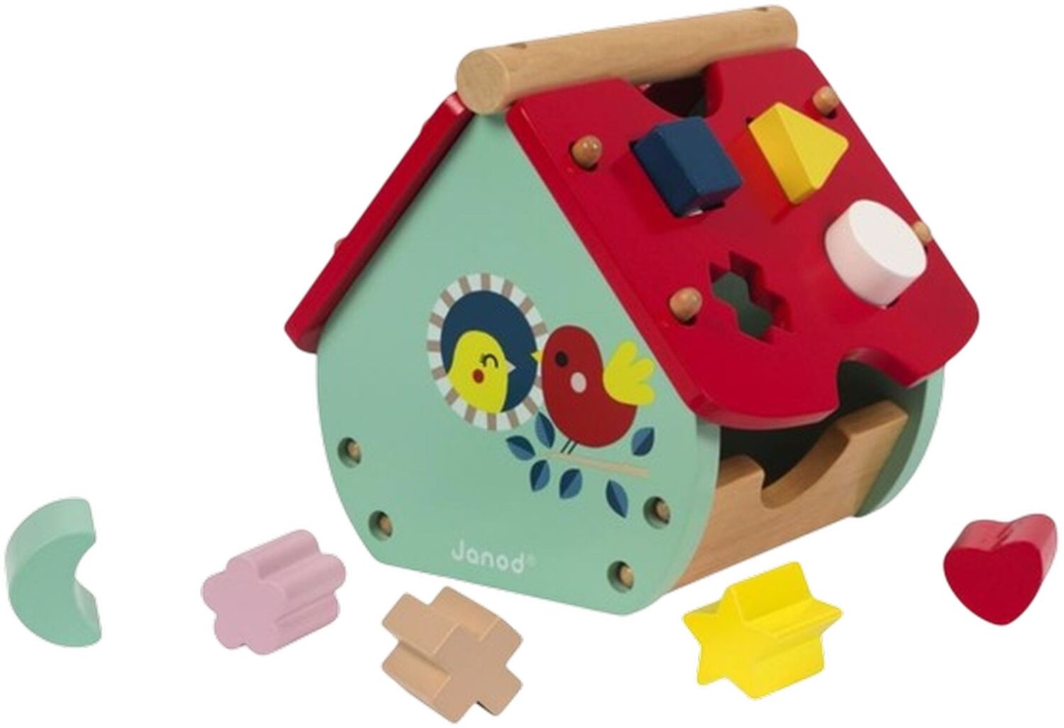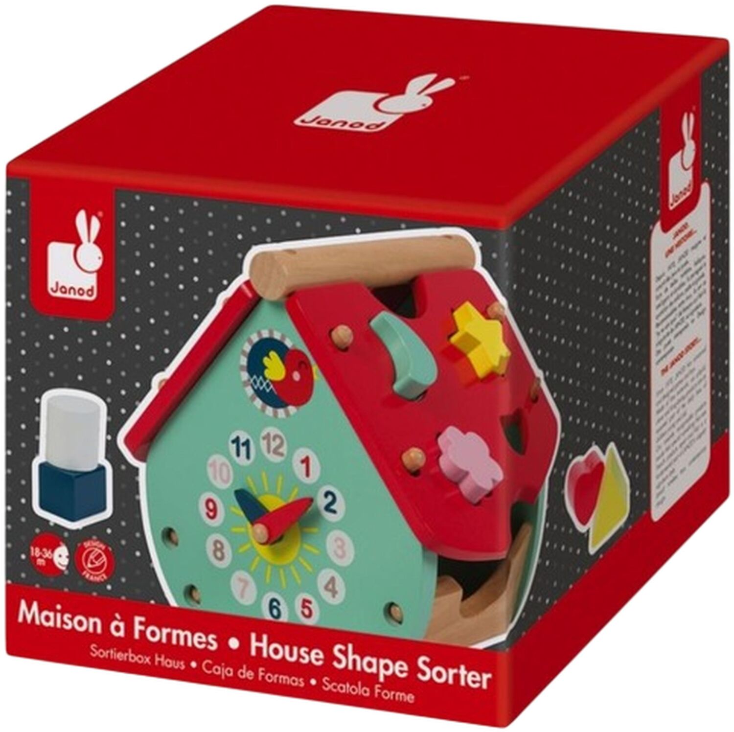 Різнобарвна хатинка - ідеальна іграшка для вивчення кольорів і форм від французького виробника Janod. Також на будиночку є іграшковий годинник, який допоможе дітям навчитися називати час. Для сортера передбачено 8 об'ємних фігурок різних кольорів і форм: зірочка, сердечко, півмісяць, квіточка та інші. Дах знімний. Іграшка розвиватиме моторику рук, сприйняття кольорів і форм, логічне мислення. Всі елементи зроблені з натурального дерева, якісно обробленого, покритого безпечними фарбами. Сортер постачається у фірмовій коробочці, він займає небагато місця, тому його можна взяти з собою.