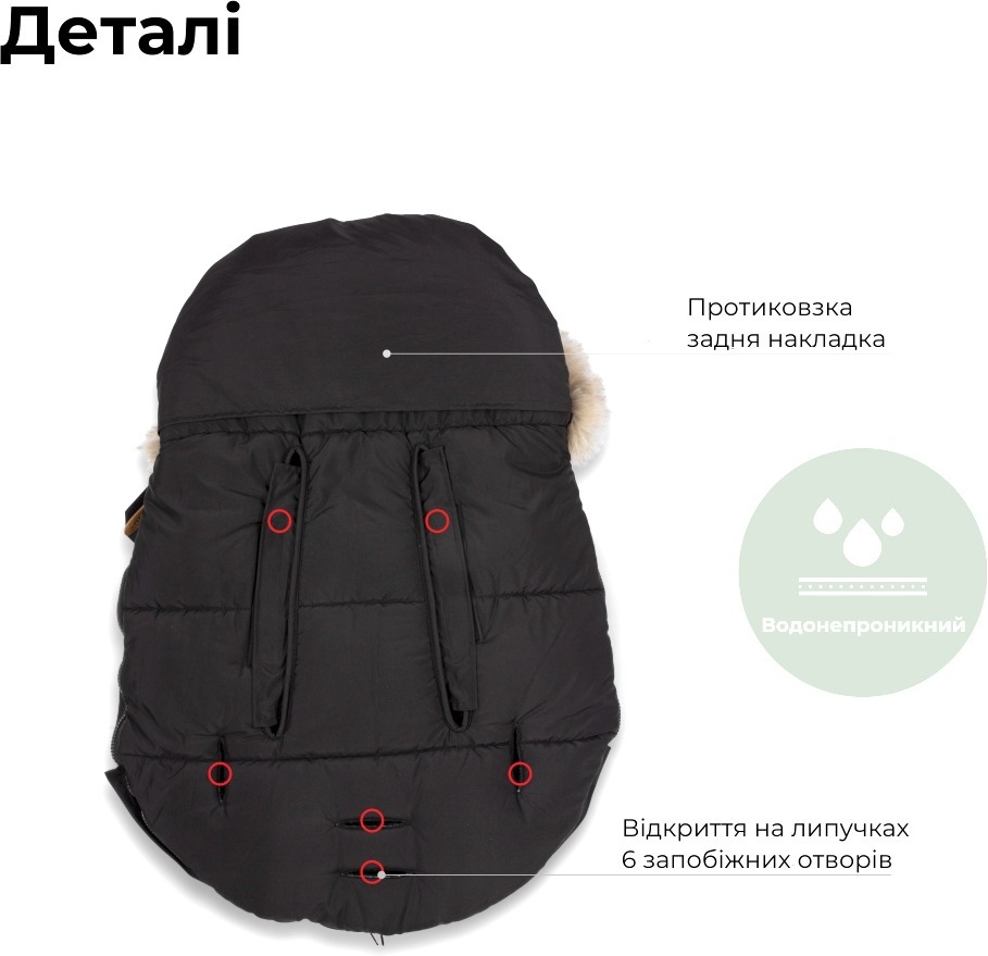 Завдяки водонепроникному матеріалу вашому маляті буде сухо та комфортно, що робить його незамінним аксесуаром для зимових прогулянок. Цей спальний мішок розроблений таким чином, щоб забезпечити максимальне тепло та захист, завдяки товстій утепленій підкладці, яка захищає від вітру та снігу.