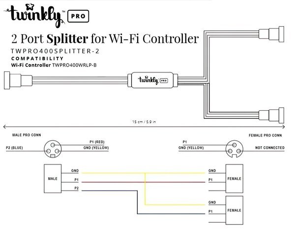 Twinkly PRO 2 Port Splitter сумісний з Wi-Fi контролером TWPRO400WRLP-BEU і застосовується для поділу лінії на дві при підключенні світлодіодних керованих гірлянд Twinkly PRO.
