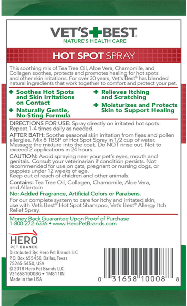 Для усунення подразнень, викликаних сезонними алергіями, наприклад від укусів бліх або пилку, змішайте 8 столових ложок Hot Spot Spray та 1/2 склянки води. Втирайте суміш в шерсть масажними рухами. Не змивати! Уникайте контакту спрею з очима. Використання засобу не рекомендоване котам та вагітним тваринам