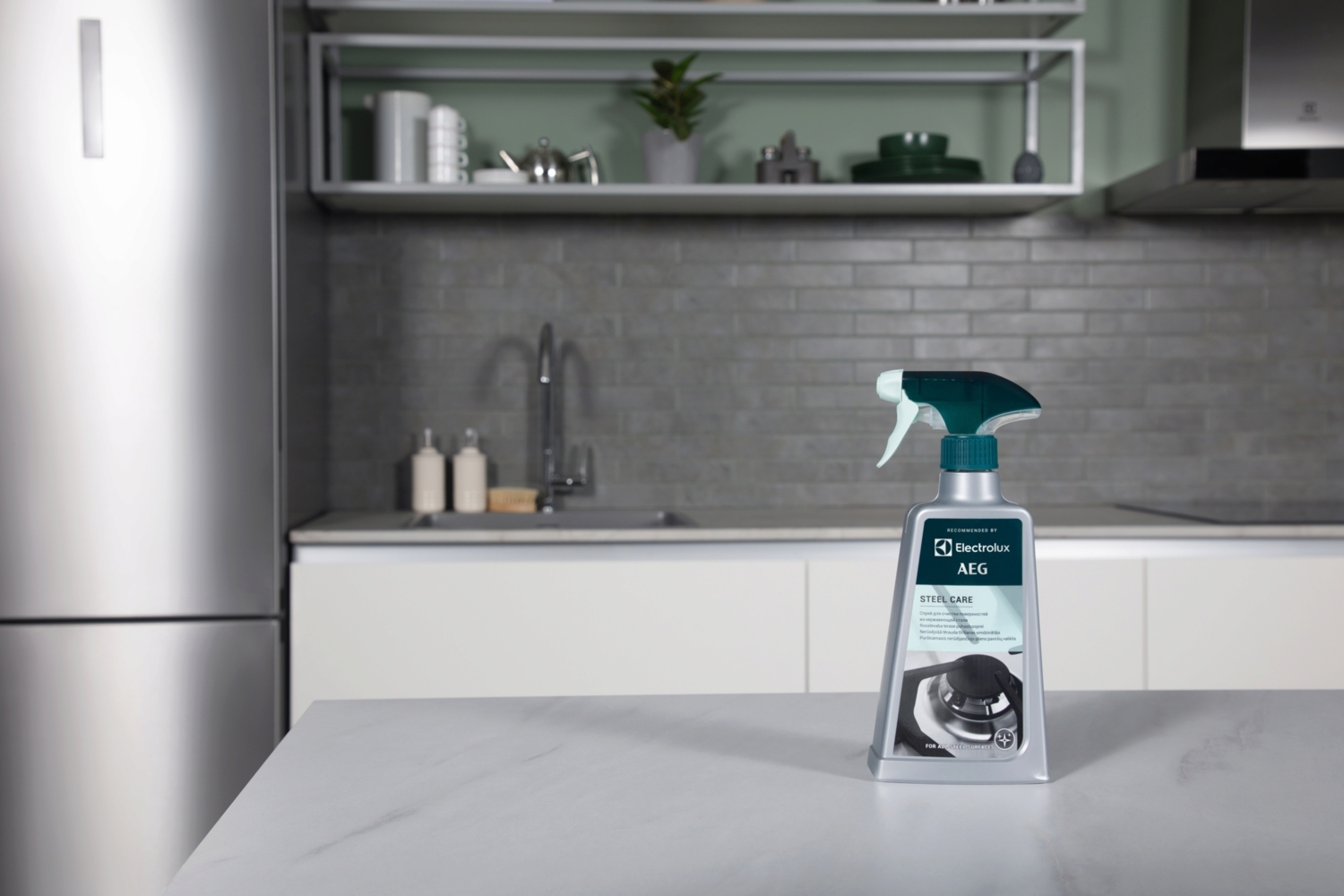 Надайте поверхням з нержавіючої сталі справжнього блиску з нашим очищуючим спреєм. Він лагідно очищує та полірує всі поверхні — від кухонних витяжок до холодильників.