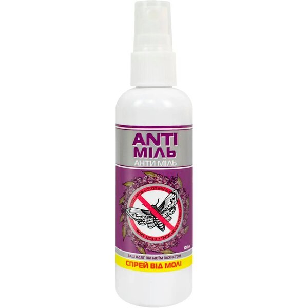 Спрей Anti Моль - рідина прозорого кольору в прозорій ПЕТ пляшці з розпилювачем і ковпачком. Не допускається для застосування від харчової молі та поруч із харчовими продуктами. Ефективно працює на виробах зі шкіри, хутра та текстилю, захищає не тільки від молі, а й від її личинок. Засіб не має різкого або неприємного запаху. Не забруднює одяг, не залишає на ньому плям або смуг. Надає речам приємний і легкий аромат лаванди. Починає діяти з моменту нанесення засобу на поверхню.