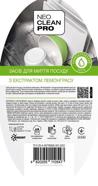 - Засіб для миття посуду Biossot NeoCleanPro з екстрактом лемонграсу 1л