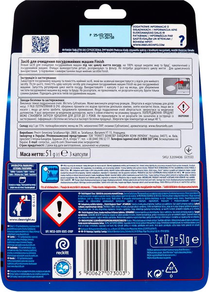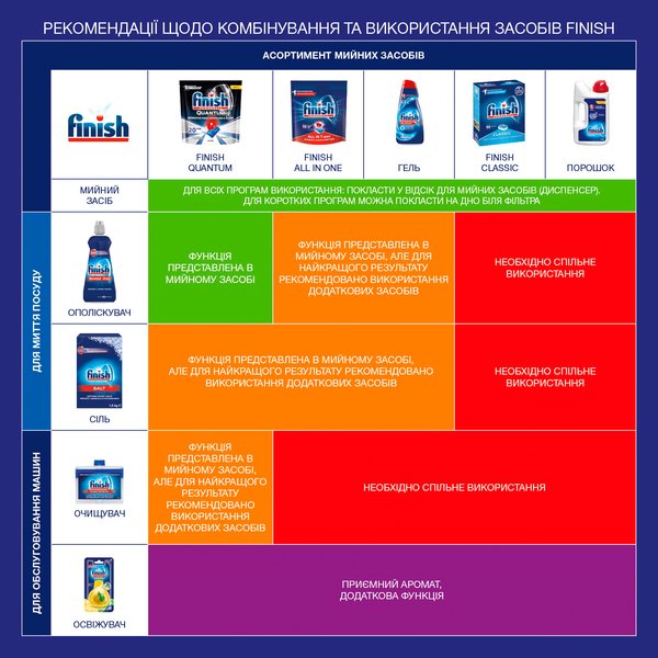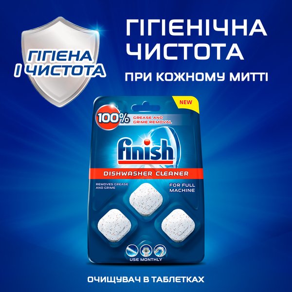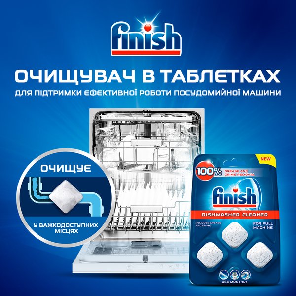 Брудна посудомийна машина не дасть вам бажаних результатів очищення. Жир і вапняний наліт можуть накопичуватися у прихованих частинах посудомийної машини. Засіб для миття посудомийних машин Finish In Wash містить на 100% більше активних речовин для видалення жиру, ніж звичайний миючий засіб, що дозволяє видалити жир і накип з посудомийної машини, одночасно очищаючи ваш посуд.