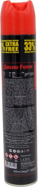 Аерозоль Дихло Force - ефективний універсальний інсектицидний засіб в аерозольному пакуванні побутового призначення проти всіх відомих видів комах. Без запаху. Хочете позбутися летючих і нелетючих комах у приміщенні? Використовуйте дихлофос Дихло Force. Універсальний аерозоль ефективно бореться з комахами, що повзають, стрибають, літають. Засіб можна використовувати в житлових приміщеннях або на роботі. Дихлофос усуває комах через кілька хвилин після розпилення. Аерозоль рівномірно розподіляється, не залишаючи слідів на поверхнях. Засіб витрачається економічно. Одного балона об'ємом 400 мл вистачить надовго.