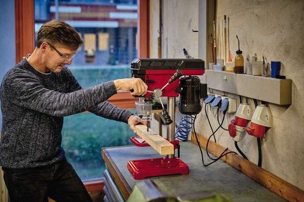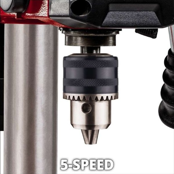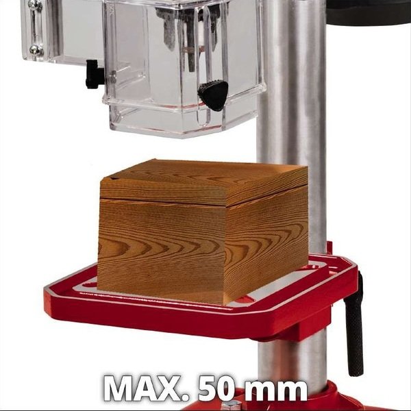 Точне свердління отворів можливе завдяки регульованому обмежувачу глибини. Максимальна глибина свердління - 50 мм. Настільний дриль оснащено надійним патроном-зірочкою і гніздом B16, що дає змогу використовувати свердла з конусом Морзе і звичайні коронки діаметром від 1,5 до 13 мм. Розточувальний шпиндель із шарикопідшипником забезпечує довговічність і простоту роботи. Роботу настільного дриля можна варіювати завдяки плавно регульованому по висоті свердлильному столу. Крім того, свердлильний стіл можна повертати на 90° і нахиляти на 45°. Прогумована триплеча обертове руків'я, що обертається, добре зарекомендувала себе завдяки сприятливому важільному ефекту за умови точного контактного тиску без витрати сили. Складаний кожух для захисту від стружки і вимикач з нульовою напругою запобігають мимовільному запуску верстата після відключення живлення.
