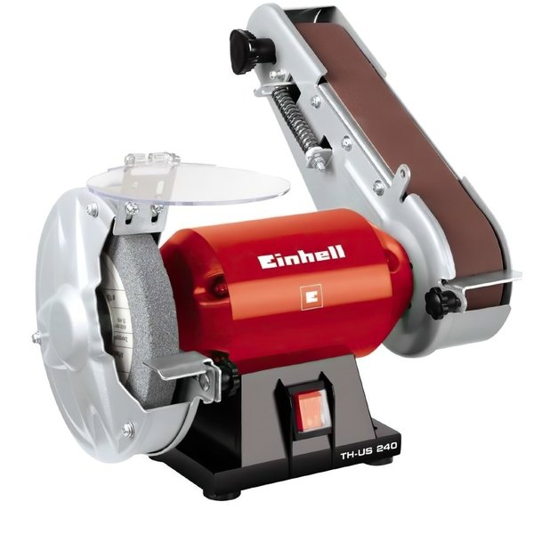 Стрічковий точильно-шліфувальний верстат Einhell TH-US 240 є комбінованим пристроєм для грубої і остаточної шліфовки металевих, пластмасових та дерев'яних предметів з використанням шліфувального диска або шліфувального паперу. Точило має чорновий шліфувальний круг зерно 36, закритий з боків захисним кожухом і іскрозахисними екраном, регульований робочим упором, що робить роботу з точильним верстатом Einhell TH-US 240 зручним і безпечним. Наявність шліфувальної стрічки дозволяє робити як грубу, так і чистову обробку матеріалу в залежності від зернистості використовуваної стрічки (з заводу встановлена стрічка Р80). Особливості Іскрозахисними екран з великим склом Регульований робочий упор Закриті з боків захисні кожухи Міцний металевий корпус Чорнової і чистової шліфувальні круги Добре отбалансірованний вал і великі прецизійні шарикопідшипники 4 антивібраційні гумові ніжки для стійкості Технічні характеристики Підключення до мережі: 230В ~ 50Гц Потужність: 240 Вт S2 30 хвилин Частота обертання на х.х .: 2950 об/хв Шліфувальний круг: Ø 150 x Ø 12.7 x 16 мм Шліфувальна стрічка: 50 x 686 мм Швидкість стрічки 900 м/хв Вага нетто: 7,15 кг