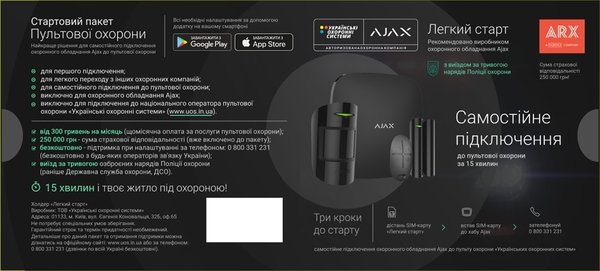 Створений спеціально для користувачів обладнання AJAX, які мають бажання швидко та без особливих зусиль підключити своє обладнання до пультової охорони. Компанія “Українські охоронні системи” працює по всій територій України та надає послугу "Легкий Старт" як для приватних осіб, так і для бізнесу. Для підключення обладнання AJAX потрібно: вставити SIM-карту до вашого AJAX Hub, а потім зв'язатися з контакт-центром за телефоном або за допомогою зручного для вас мессенджера. Для користувача вся процедура триває не більше 15 хвилин.
