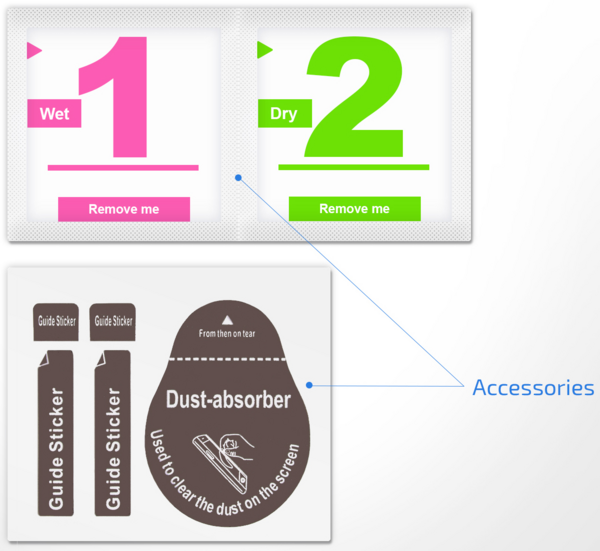 - Комплектація: Захисне скло, спиртова серветка для попереднього очищення, серветка з мікрофібри, стікер для видалення пилу з екрану.