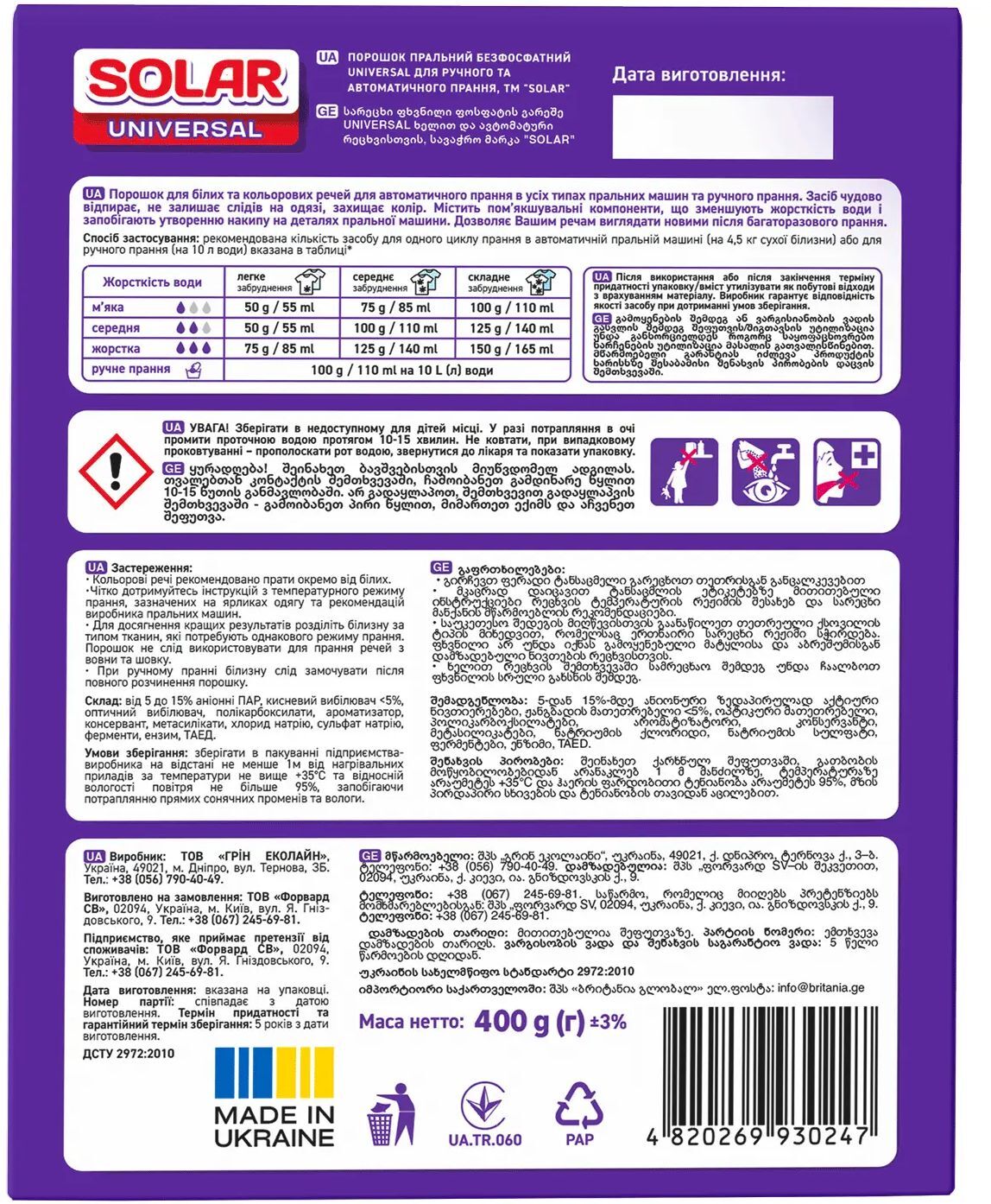 - Пральний порошок Solar Universal для ручного та автоматичного прання 400 г