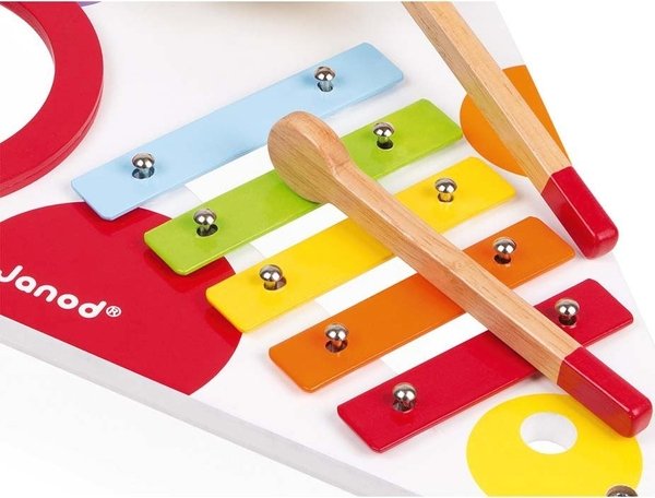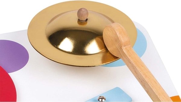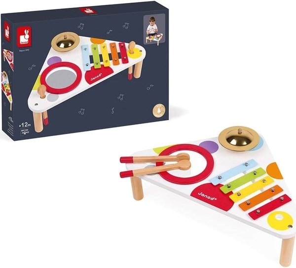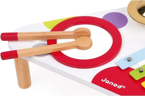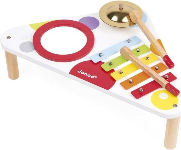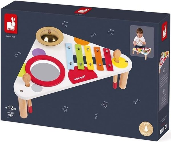 Чарівний розвивальний столик для дітей від французького бренду Janod. Тут дітлахи знайдуть: ксилофон, дзвіночок та міні-барабан. Пара паличок допоможуть дітям досліджувати звуки, які видає кожен елемент. На ксилофоні можна навіть навчитися грати мелодії. Інтерактивний столик завжди приваблюватиме дітей і спонукатиме до розвитку слухових, зорових і тактильних відчуттів, а також до імпровізації. Столик і палички виготовлені з натурального дерева - воно чудово оброблене та вкрите безпечними фарбами на водній основі. Дзвіночок дзвінко дзвенить, на ксилофоні можна зіграти приємну мелодію. Дзвіночок і пластини ксилофона виготовлені з металу, вони надійно прикручені до основи. Елементи безпечні та краї не гострі. Поставляється в розібраному вигляді. Збирається легко і швидко - три ніжки прикручуються до основи з інтерактивними елементами. Габарити столика: 40х25х15 см.