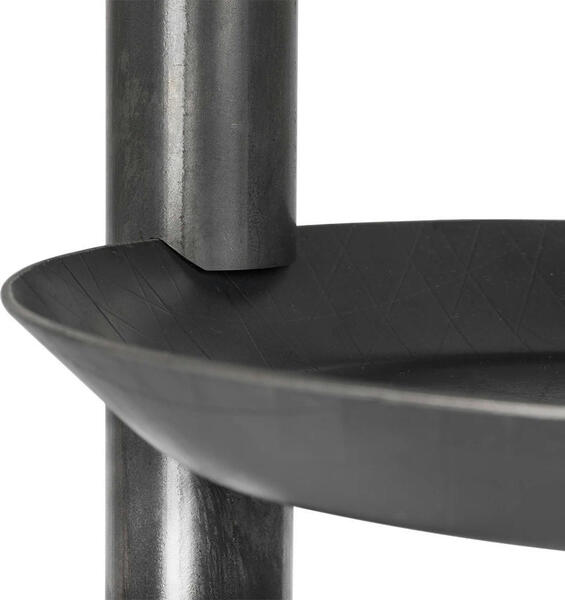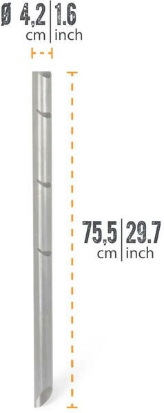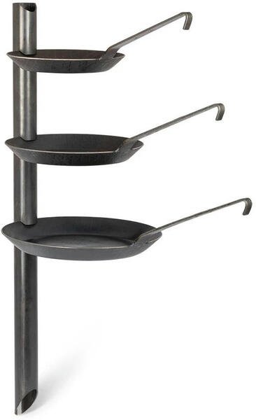 Сталева основа встромляється у землю поруч із багаттям або мангалом. Має три отвори, щоб фіксувати сковороду на різній висоті над самим центром полум’я. Положення посудини, а отже й температурна зона, змінюється одним рухом: виймаєте сковороду з одного заглиблення і ставите в інше. Жодного перекладання дров чи очікування, поки утвориться вугілля!