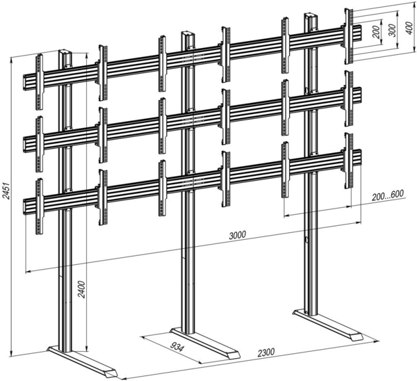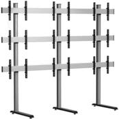 Підлогова стійка для відеостіни VSP4433F з опорами з алюмінієвого профілю застосовується для зручності монтажу та подальшого технічного обслуговування відеостіни. Дисплеї встановлюються по всій висоті опор до 2400 мм. Система мікро-регулювання в 3 площинах дозволяє вирівняти екрани в безшовну відеостіну. У даній моделі передбачений захист від випадкового підбиття дисплея, а також приховане укладання кабелів. Стійка підходить для РК / LED телевізорів c діагоналлю 46-55 дюймів і вагою до 50 кг на один дисплей. Довжина горизонтальних опор -3000 мм. Стандарт VESA: min 200×200, max 600×400 mm.
