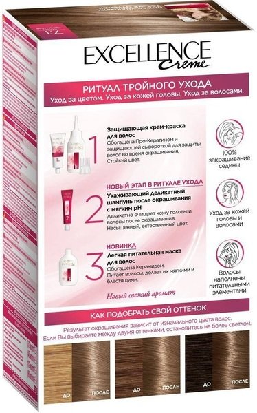 Excellence від L'Oréal Paris – крем-фарба з потрійним доглядом для волосся, яка захищає під час фарбування. 100% зафарбовування сивини. Будь-який відтінок волосся, будь-коли, без тіні занепокоєння.