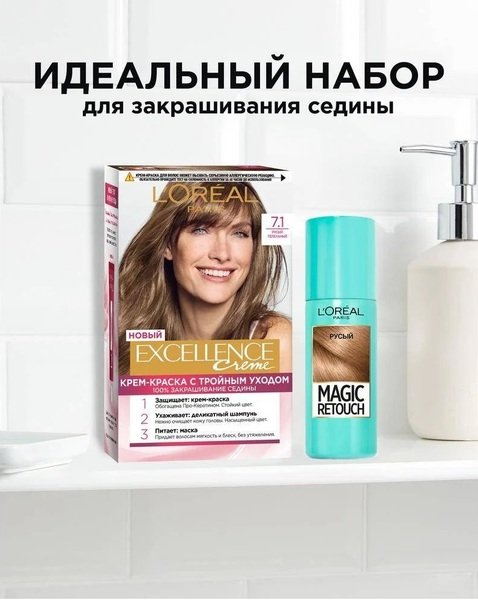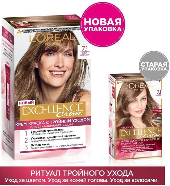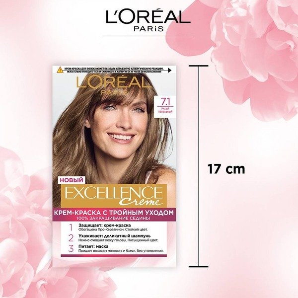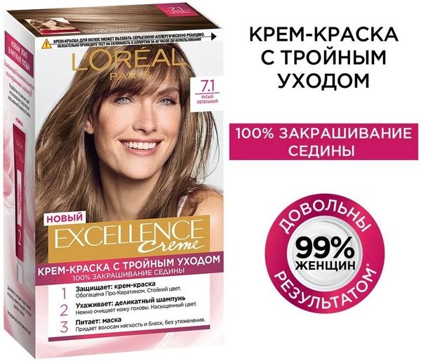 - Стійка крем-фарба для волосся L'Oreal Paris Excellence Creme 7.1 Русявий попелястий
